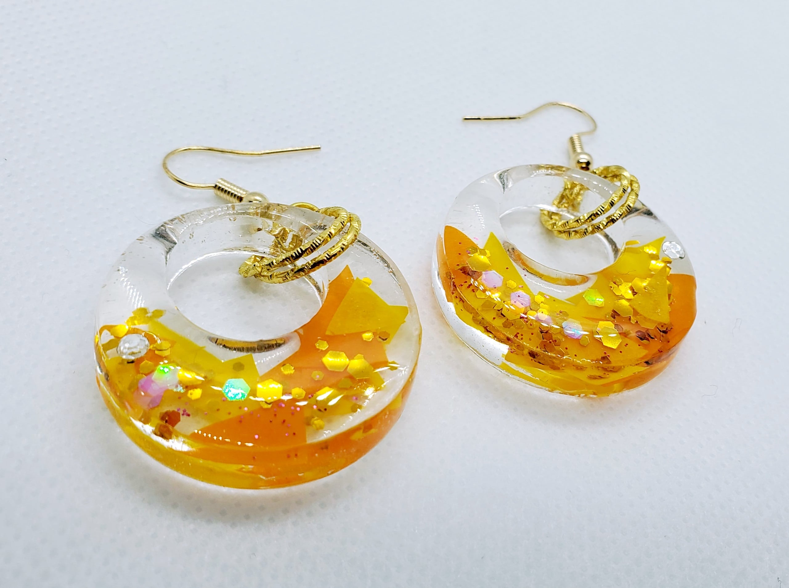 黄色とオレンジ色の紙を三角に切ったものを背景に散りばめ、複数の六角ラメで太陽のような煌めきを表現しました。