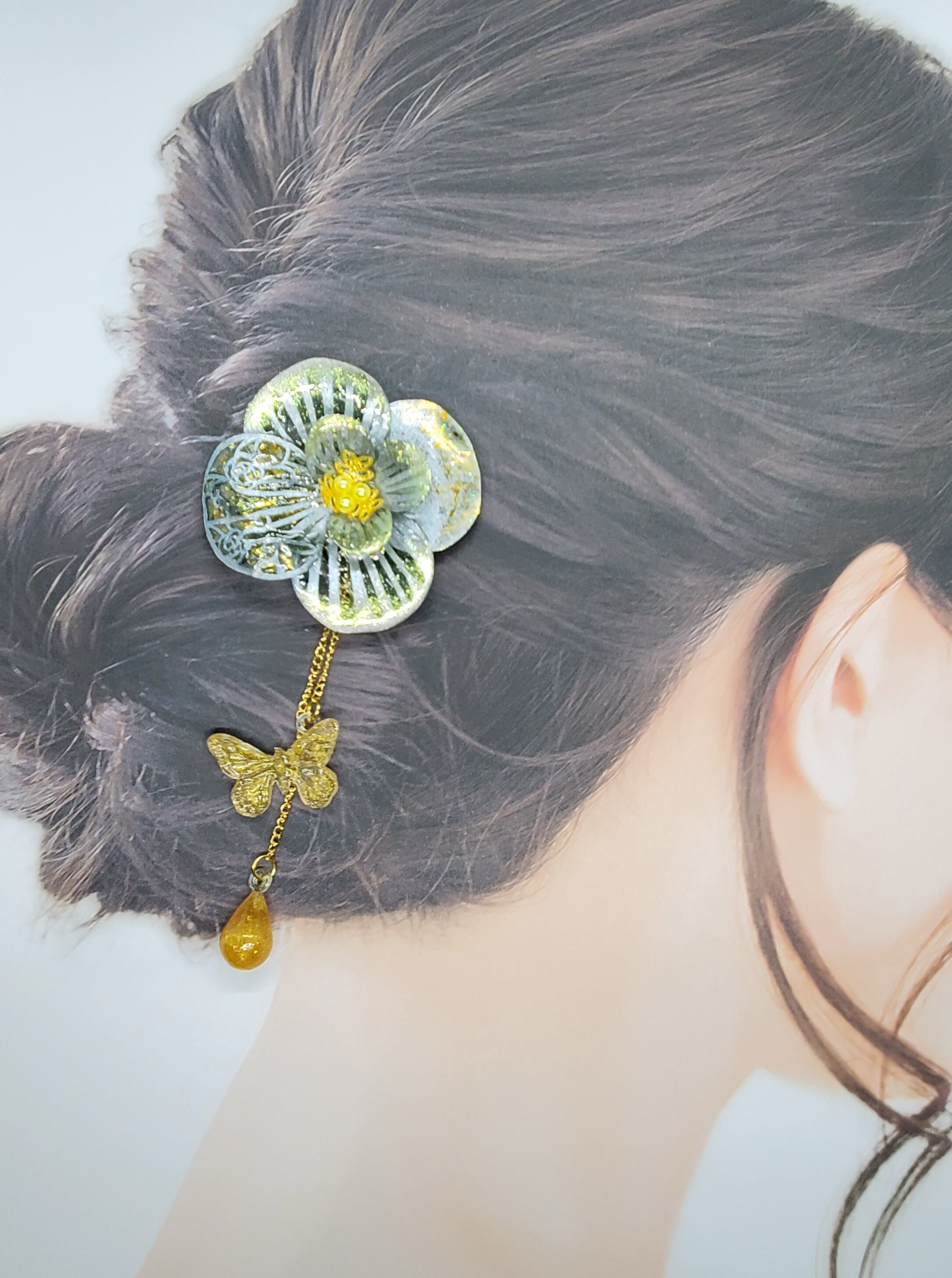 お花の色は銀色、金色の蝶々と雫のパーツを細身のチェーンで繋いでいます。