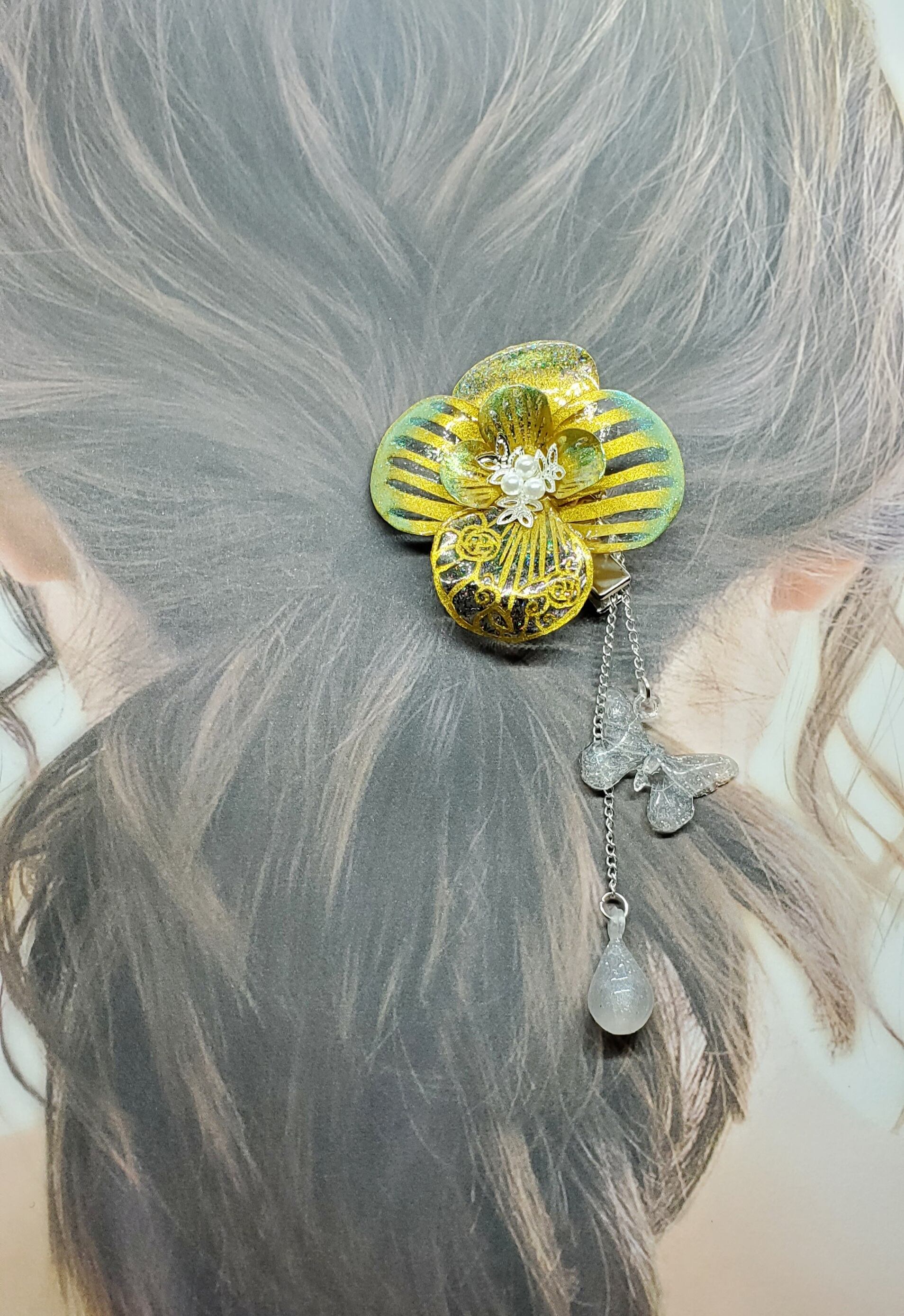 お花の色は金色、有料オプションで銀色の蝶々と雫のパーツを細身のチェーンで繋いでいます。