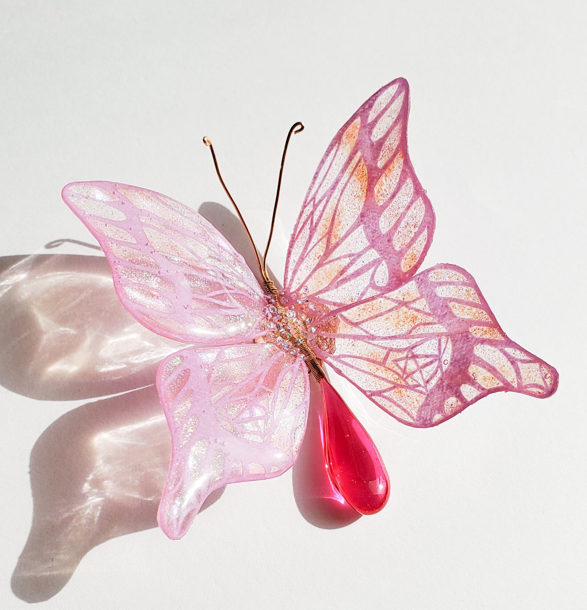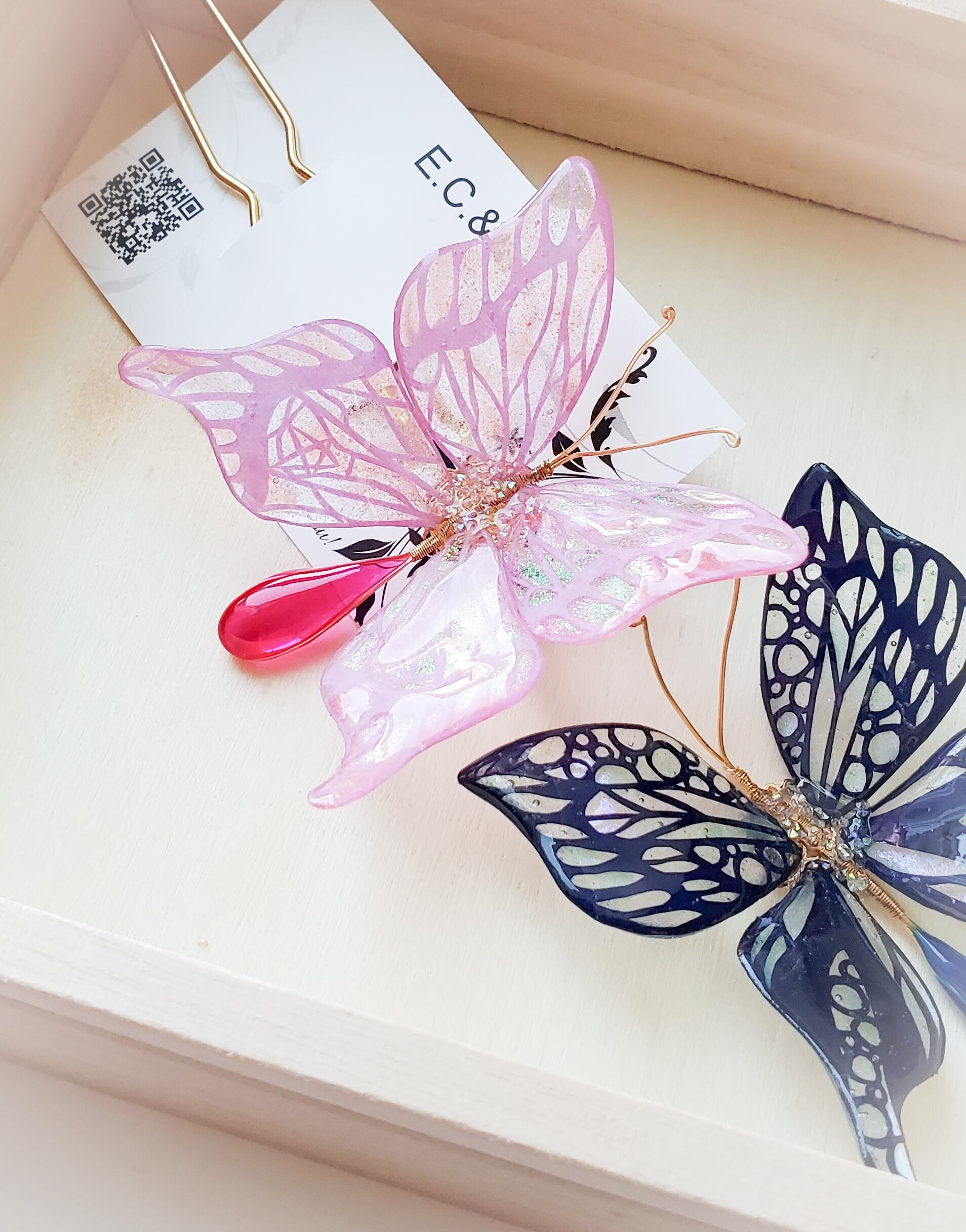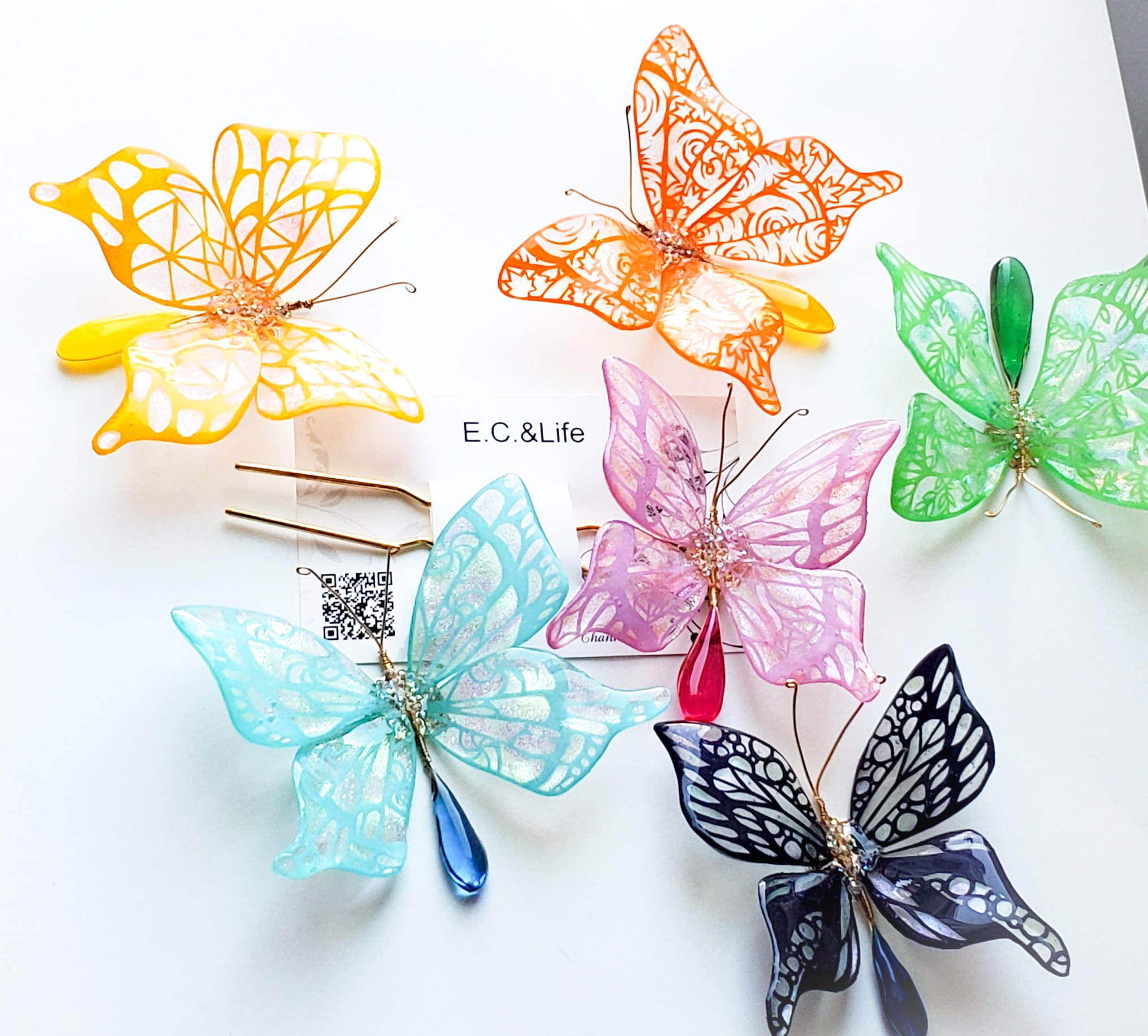 個性的な蝶々の切り絵をレジンでしっかりコーティングし、ラメでファンタジーに仕上げました。