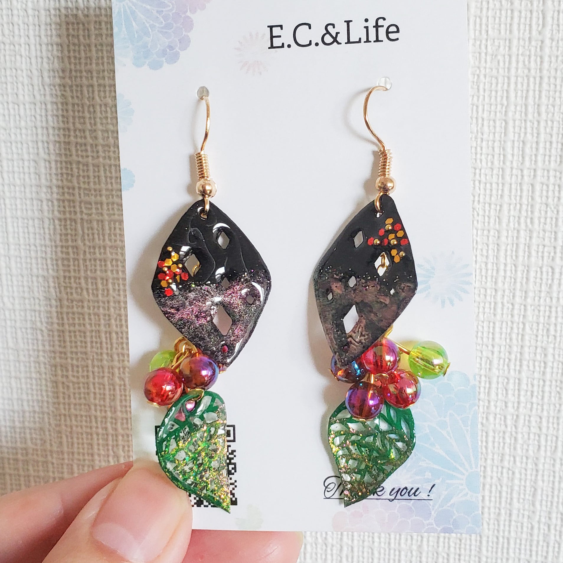 切り絵をしっかりとレジンで覆って、ある程度の強度を持たせております。日常生活で使っている分には強度に問題がないようにとは思っておりますが、もし作品が壊れてしまったりしましたら是非ご連絡ください。