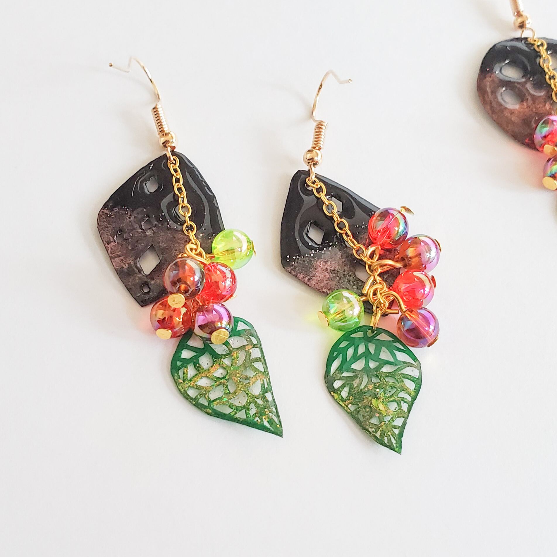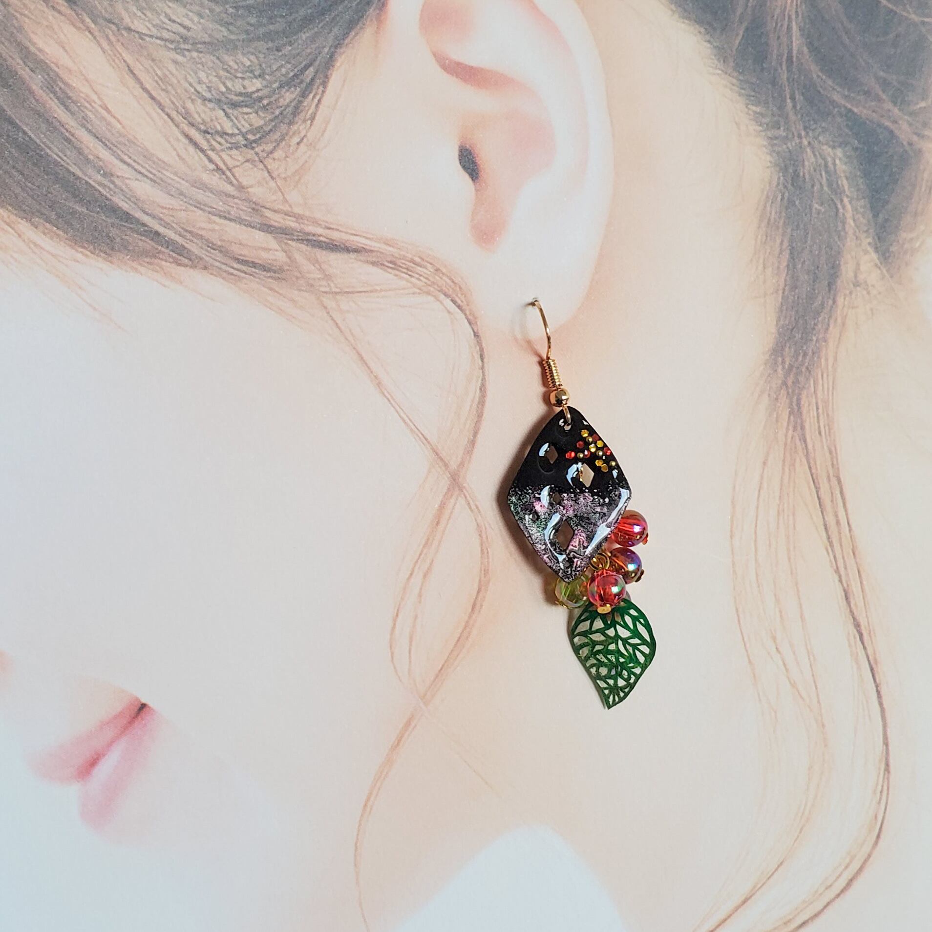 じゃらじゃらとチェーンに付けたオーロラ加工のビーズは木の実に見立て、赤系のカラーとまだ熟していない黄緑のものを一緒に実らせました。