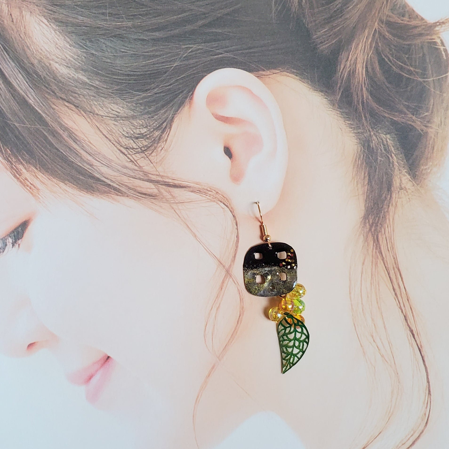 じゃらじゃらとチェーンに付けたオーロラ加工のビーズは木の実に見立て、黄系のカラーとまだ熟していない黄緑のものを一緒に実らせました。
